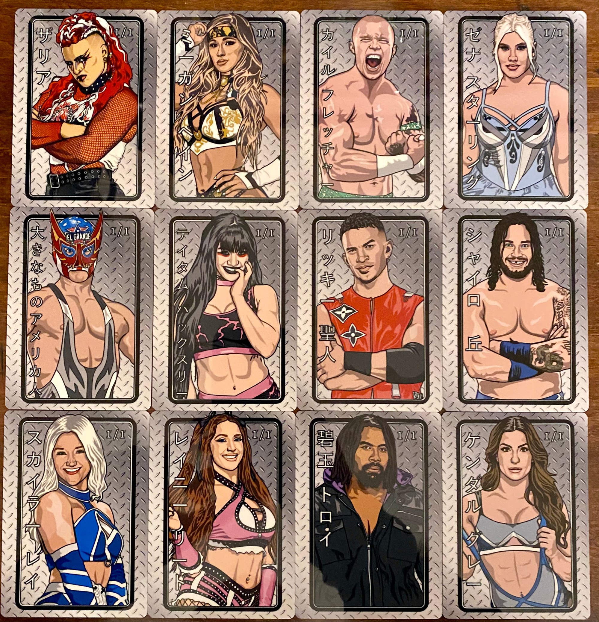 Inspired by classic Menko cards from Japan, these fully illustrated cards depict the pro wrestling rising stars in a portrait style pose, with bold color backdrops and Japanese characters. Limited to 150 sets.